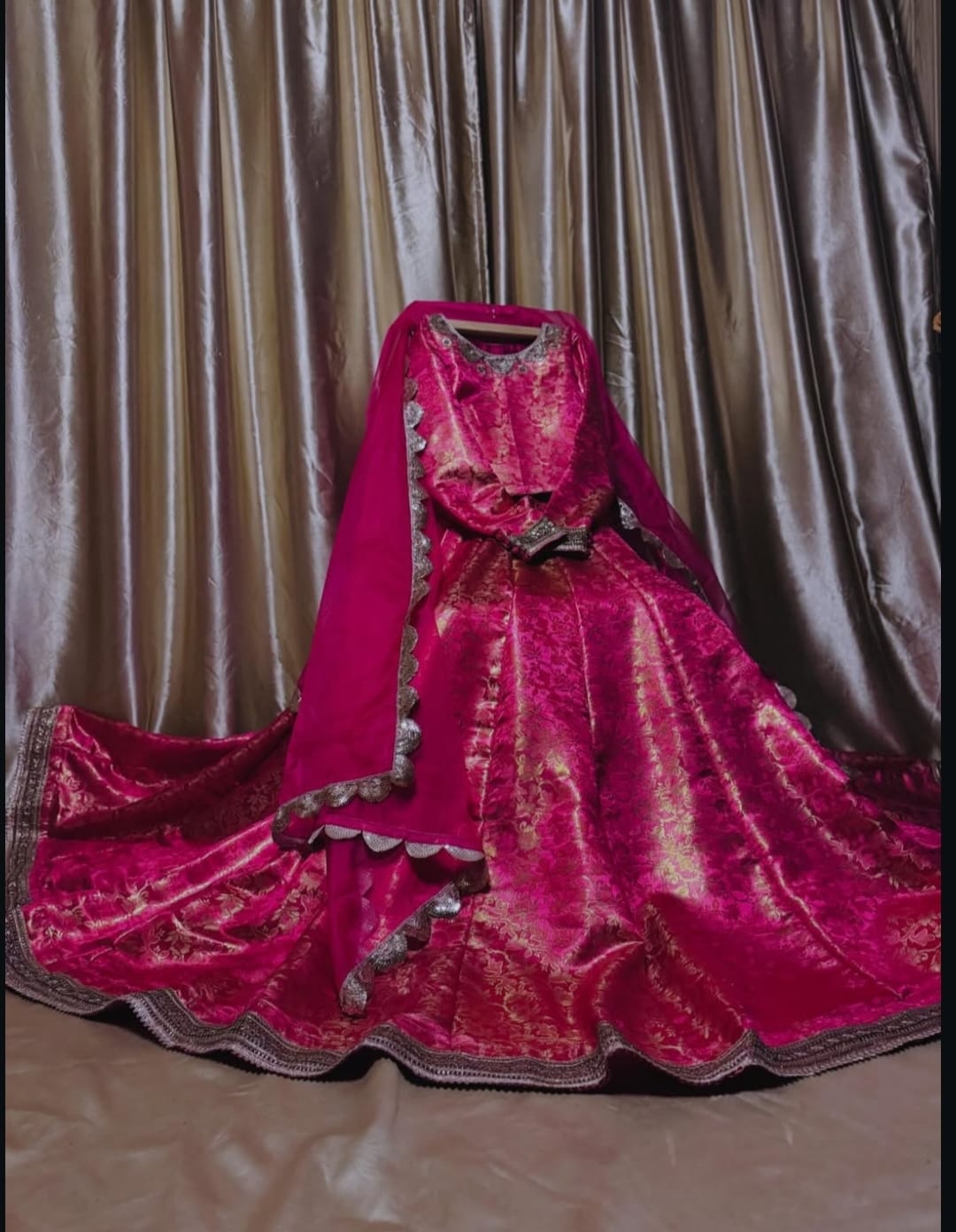 Radiate timeless charm in the Fuchsia Blossom Banarasi Set, a masterpiece of traditional craftsmanship and feminine allure. This ensemble is designed for the woman who loves the rich heritage of woven fabrics paired with a dramatic, contemporary silhouette.
