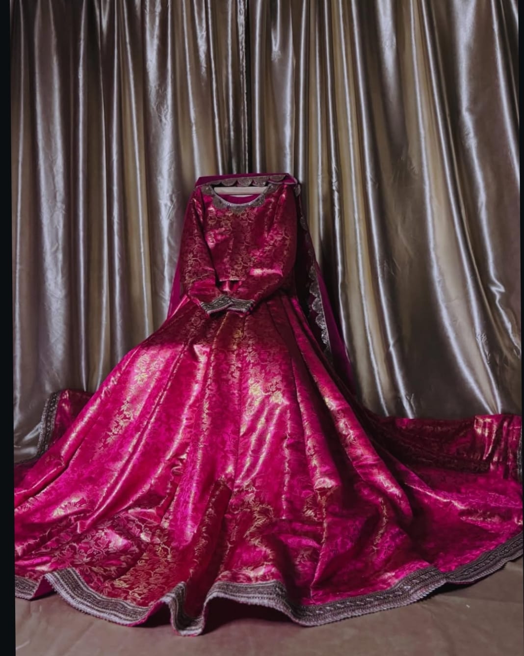 The Wide-Flared Lehenga: A show-stopping, floor-length lehenga crafted from heavy pink Banarasi silk. It is adorned with intricate gold floral and vine motifs woven into the fabric, creating a shimmering effect with every movement. The expansive flare adds a royal touch, making it an ideal choice for grand celebrations.